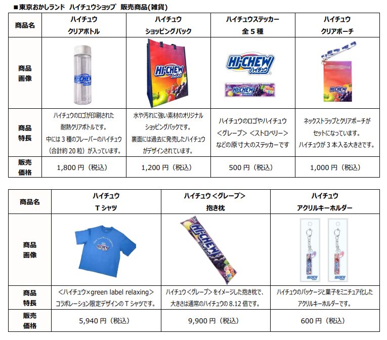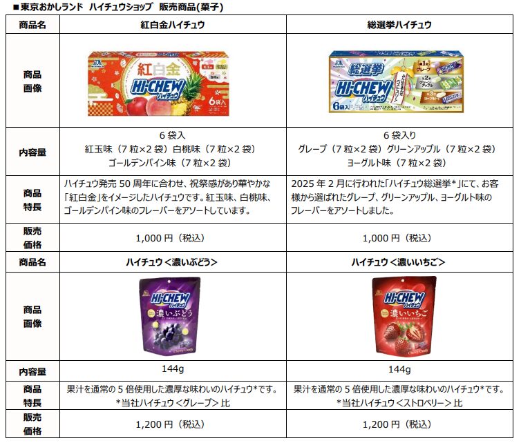 今回の東京おかしランドでの展開では、新商品「紅白金ハイチュウ」「総選挙ハイチュウ*」をラインアップに加え、さらにパワーアップいたします。 イベント限定ハイチュウ、Tシャツ、オリジナルステッカー、ポーチなど、同店でしか手に入らない限定商品を取り揃え、東京おかしランド「ハイチュウショップ」でしか楽しめない特別な空間を提供いたします。